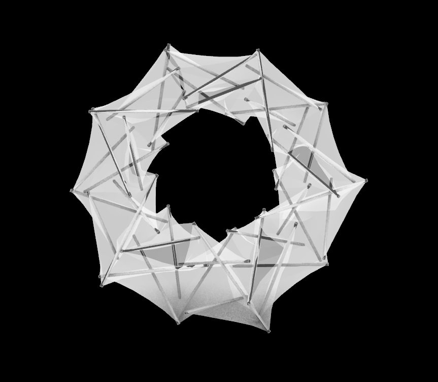専門用語で「膜テンセグリティ構造」とよばれるこの構造は、伸縮性の膜を引き伸ばしながら棒を固定すると、平面から立体へと立ち上がります。棒同士は触れ合っていなくても膜の張力で力がつりあうので、まるで棒が宙に浮いているように見えます。バックミンスター・フラーの表現を借りるなら「張力の海に浮かぶ圧縮力の島」のような構造です。従来の膜構造では実現できなかった大きな開口部を持ち、まるで貝殻のような螺旋を描く構造です。